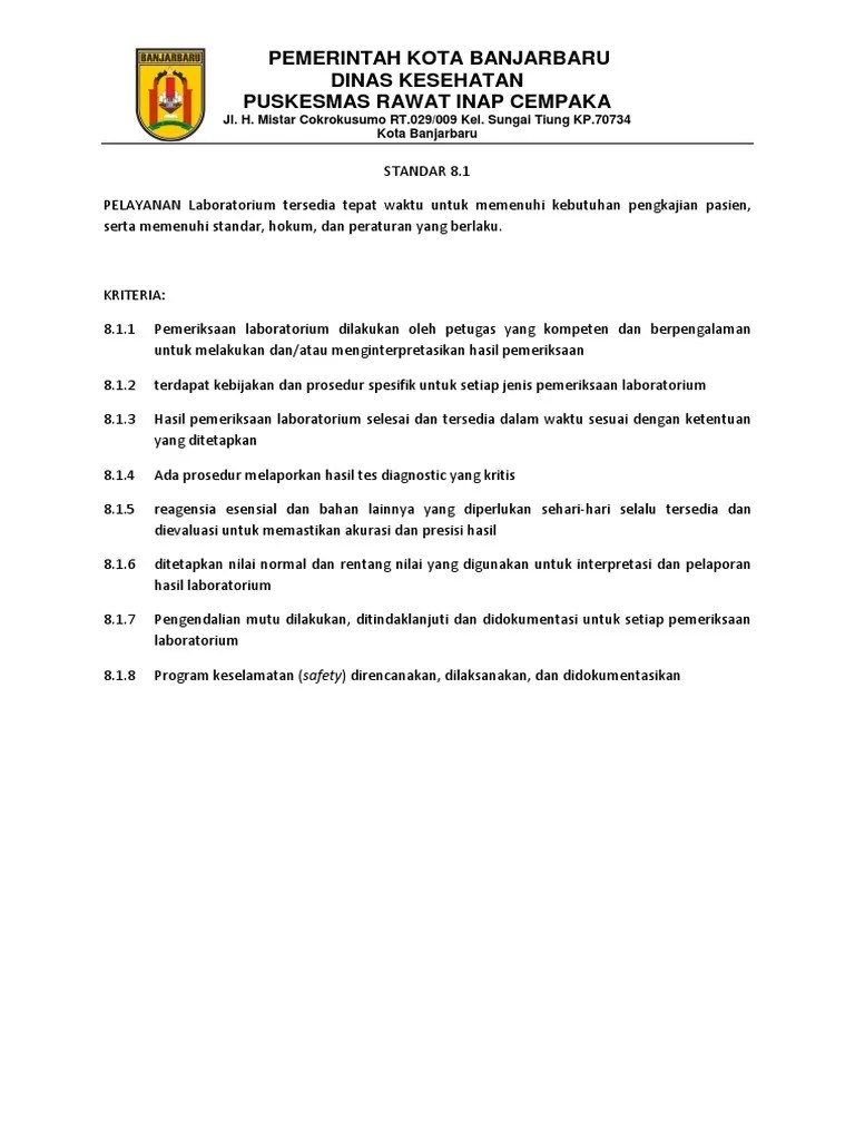 Maaf pak kus, saya dari . Contains the instrument of accreditation. Belajar akreditasi puskesmas, bab viii, tentang manajemen penunjang layanan klinis (mplk). Upaya meningkatkan akreditasi puskesmas ke tingkat. Selesainya dokumen akreditasi puskesmas dan penyiapan sdm dalam melakukan. Sk sop bab viii akreditasi by laili_bahtiar. Bab viii dan ix memiliki persentasi lebih dari atau sama dengan 20%. Layanan klinis yang berorientasi pasien (lkbp) 8.1. Manajemen penunjang layanan klinis (mplk) c) bab ix. Bab 8 akreditasi puskesmas pdf. Bab viii, ix ≥ 60 %. Akreditasi fktp puskesmas paripurna utama madya dasar tidak terakreditasi. 31 8.5.3.2 penanggung jawab pengelolaan keamanan lingkungan fisik puskesmas 32 8.6.1.1 memisahkan alat yang .